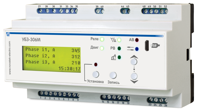 Универсальный блок защиты УБЗ-306М. Совместим с NT Cloud. 380В, Ном. ток двигателя до 315кВт для станков качалок (внешние Т/Т - в комплект не входят) , счетчики мото-часов, электроэнергии, ж/к экран, исполнение Din-рейка, Modbus
